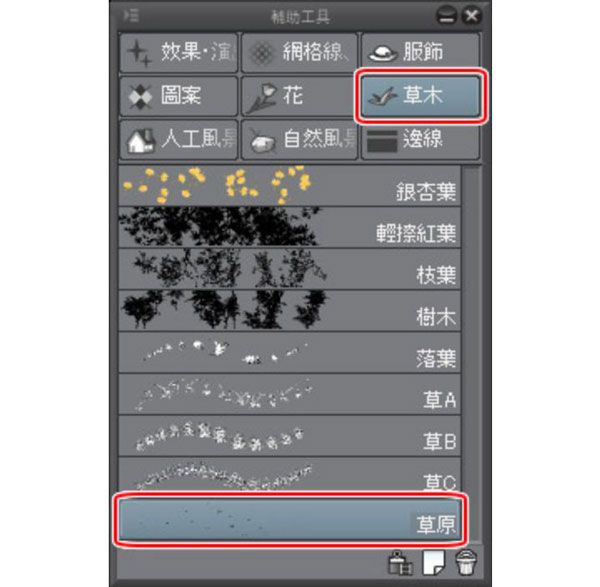 ⑤这次选择了[草木]工具群组中的[草原]辅助工具。