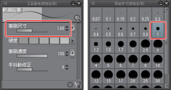 可以在[工具属性]面板上进行调整,或是从[笔刷尺寸]面板中选择尺寸。
