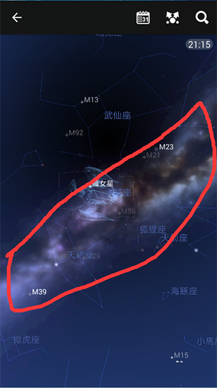 3、我进入系统的坐标为地球,用手指旋转界面,找到明亮的光带,那就是银河。下面三图为银河中的天鹅座、猎户座和天蝎座。
