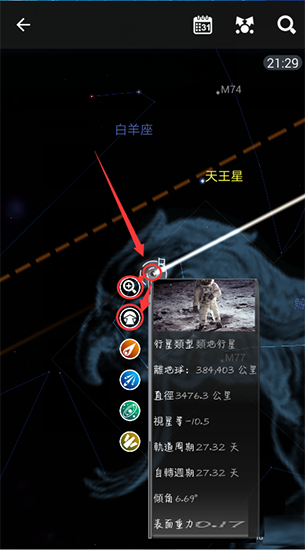 5、而这时候,你可以看到说明框左上角的那个箭头图标,和之前主菜单里3D探索模式的图标是一样的。点击这个图标,就会把探索对象切换到月球
