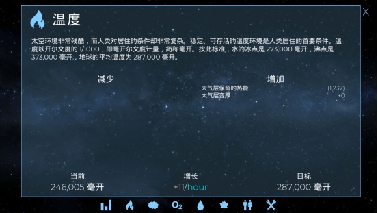 星球的每一种属性并非是独立的,它们是会相互影响的,一个没有气压的星球是无法保留温度以及氧气的,一颗温度不稳定星球海平面也总是随心所欲的。合理的安排各个设施的运行,把各个属性都调整到最优吧。推荐优先稳定温度与气压。