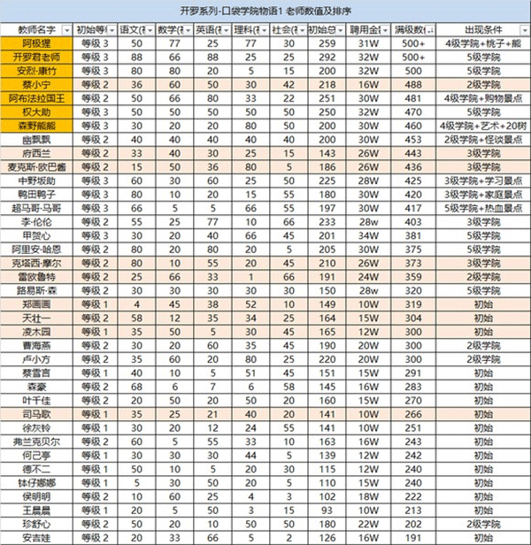4、【初期老师选择】浅橙色底色是初期好用的老师,每个班都要单配一个老师,否则下降声望。10W-16W的初期用非常好,除了小蔡你们有钱可以升级,其余不要升级!点数很珍贵,后期直接换了。