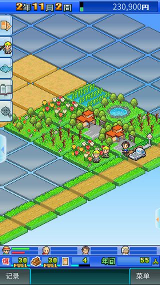 一进入游戏的时候对于界面还是很熟悉的,由于开罗系列的发展方向早已经确定,所以整体格局不会有太大变化,玩家在这款游戏中需要通过努力,发展营造良好生活环境的园林养生旅游景点。在操作上游戏仍然采用俯视视角的点面建造,除了主题改变以外,过程与前几款作品还是比较类似的,值得一提的是,游戏加入了水利系统,使得布局从地上延伸到了地下。
