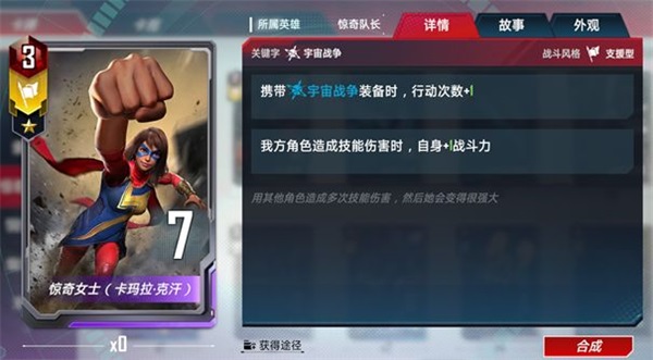 宇宙战争阵营是所有阵营中拥有支援型角色最多的阵营(甚至一个进攻型角色都没有)。当然他们也有大部分支援型角色共通的特点战斗力较低。不过宇宙战争阵营中的支援型角色大多都有一种特色,就是用多次行动的机会来弥补自身卡牌战斗力弱的问题。下面罗列的三张卡牌惊奇女士、罗南、惊奇队长都可以在多次行动后获得巨大收益。当然多次行动是有条件的,需要角色装备宇宙战争的装备来实现。这也是该阵营的第二种来弥补卡牌战力偏低的办法。
