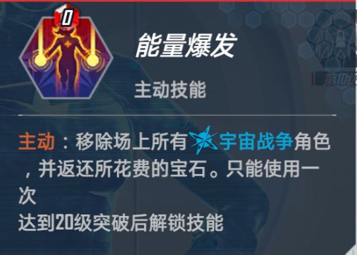 能量爆发:主动,不消耗宝石。移除场上所有宇宙战争角色,并返还花费的宝石。只能使用一次。