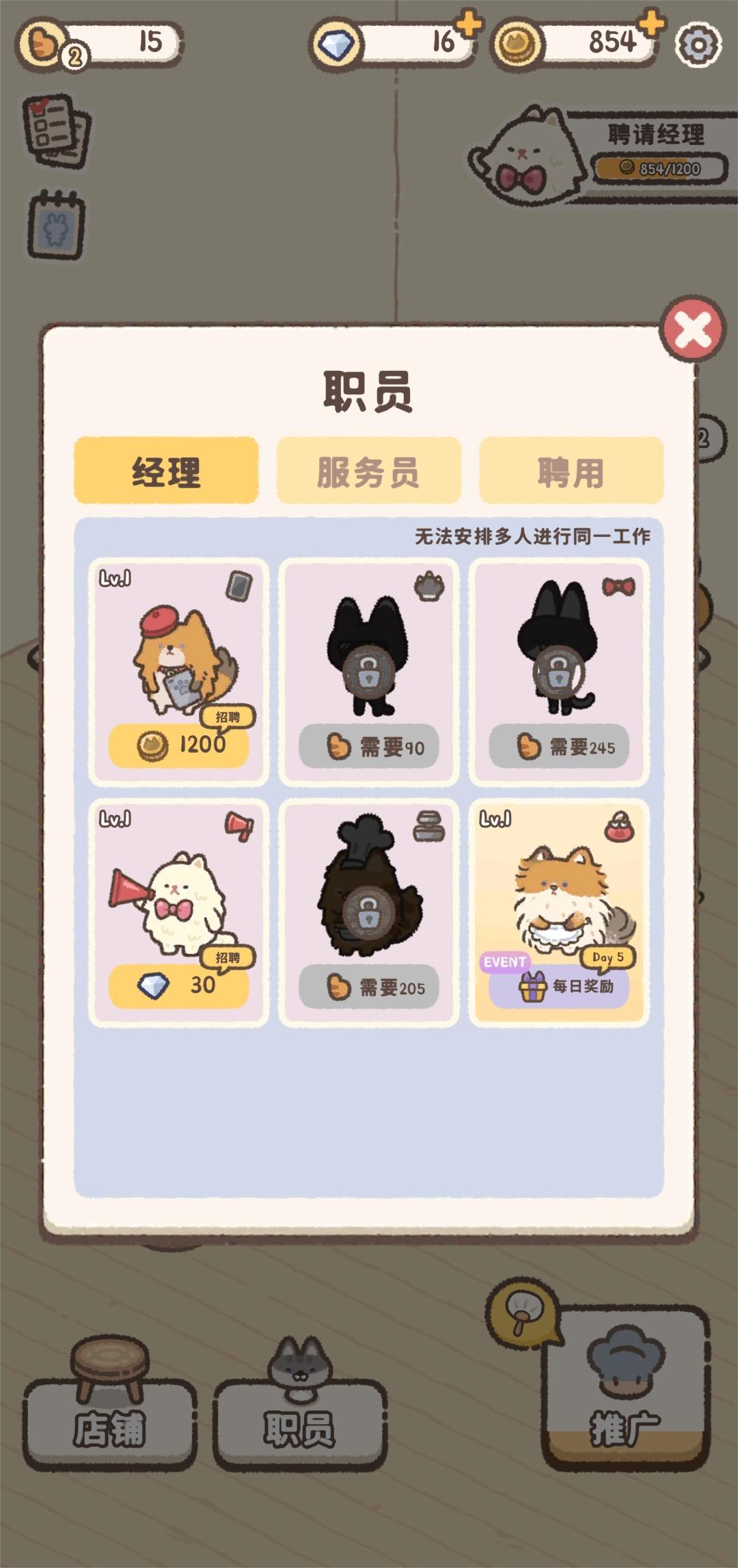 6、达到一定等级就可以雇佣职员。经理小猫们都有不同的技能,例如赶走讨厌的客人、加快推广速度等等。服务员们的作用则是提高客人小费。简而言之就是——小猫立大功