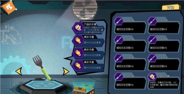 我们就拿叉子跟暴力车轮来说,叉子基础伤害很低,速度快,不适合增加伤害的配件,这里我们推荐亢奋手套加三个速度手套,亢奋手套自带红色特效,击杀加成攻速20%,持续九秒,速度手套每个增加6%的速度,这攻击速度,只能说是眼花缭乱。