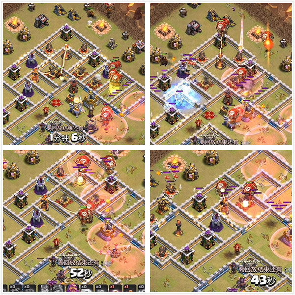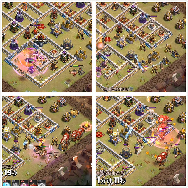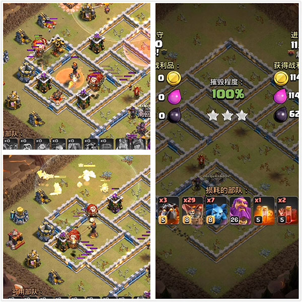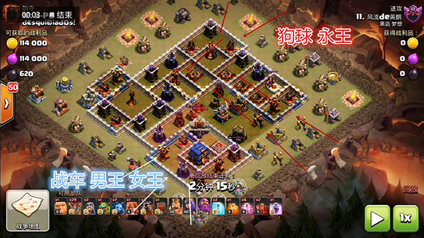 战车到对方大本营这就直接爆了,此时武神在狂暴法术的加成下如暴风雨般攻击,女王补刀。这一带的所有建筑都如纸片一般!男王清边的时候遇到了电磁塔的骚扰,不过没关系,由于本身就是个血牛,在开技能之后瞬间又补回了很多血量,所以男王同女王一样重要,切勿只升级女王而不升级男王!