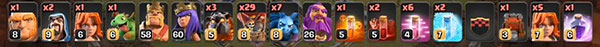 这样的狗球就是按照刚才画好的路线来进攻,配兵的时候带了3只狗和29个气球,多带气球要比多带一只狗有用。因为满级气球的血量也挺高的,对面地狱塔是单头的,所以要烧死一个气球是需要一定时间,那么我们趁这个机会就可以用气球来攻击防御建筑。就算没有狗的保护,气球依然可以消灭掉不少建筑。