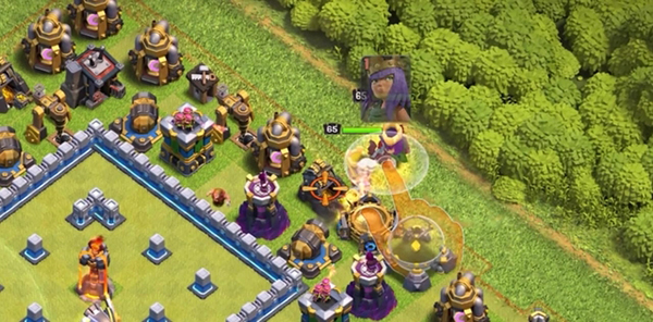 5、开局时如果攻击女王的防御建筑较少,可先等女王打掉前方建筑后再布置天使,保证天使女王和某些防御建筑的角度,比如防空火箭,多偷塔,投石炮,尽可能的让天使处于安全位置,也可以节省冰冻或隐形法术。