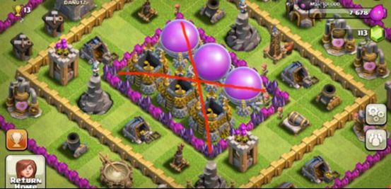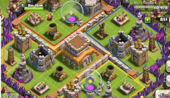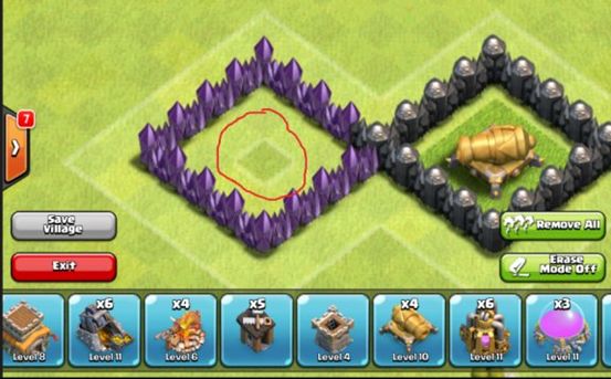 敌人在黑圈处下的炸弹人会跑去红圈处开墙,中间的法师塔有机会秒杀他们。部落城堡是新手的最强防御建筑,部落城堡里涌出的弓箭手,法师,气球,或者龙将会是许多进攻者的噩梦。布阵时切记尽量将部落城堡放置在阵型的中央,不要让敌人能轻易的勾引出你的援兵。对于新手来说从头开始打造一个阵型肯定是非常困难的。你可以通过互联网来搜索一个适合你的框架,然后通过自己的经验来改良,从而创造出一个独一无二的阵型。