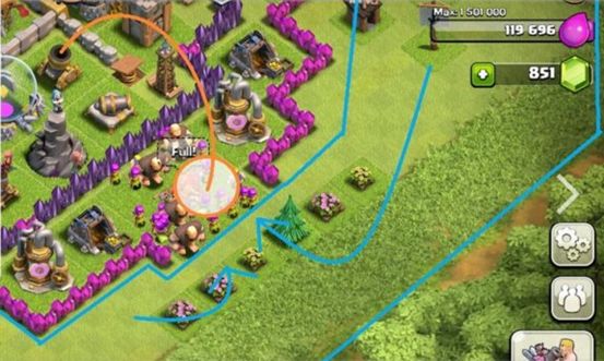 如果敌人在蓝点下弓箭手的话弓箭手的攻击顺序会是训练营-圣水采集器-金矿。需要注意的是地图的四条边并不能用来替代城墙,阻挡敌人的进攻。如下图: