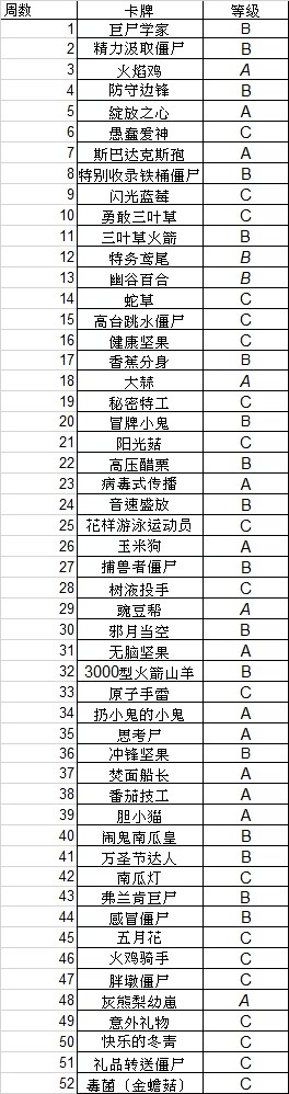 下面是植物大战僵尸英雄所有活动卡的时间和分级。一年共52周,共有52张活动卡。使用方法:先在游戏中找到当前周的活动卡,与下表做对应,然后就能找到与目标活动卡差几周。