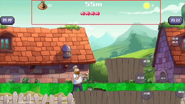 2、左下角应轮盘可以控制戴夫移动,右侧有各种功能菜单,包括闪避跳跃,近战,换弹射击以及拾取购买等。