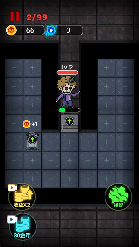2、关门上床发育,建造武器,升级床和门,噬梦者攻击门的时候我们可以点击右下角的维修;