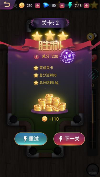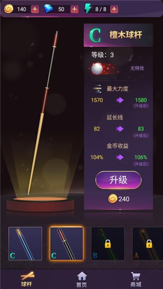 游戏还提供了丰富的装备系统,玩家可以收集各种特色球杆,有的延长线长方便进球,有的特效炫酷。在游戏中既能提升台球技巧,又能打发时间,可以说是一举两得。新手教程也很贴心,帮助新人玩家快速上手。