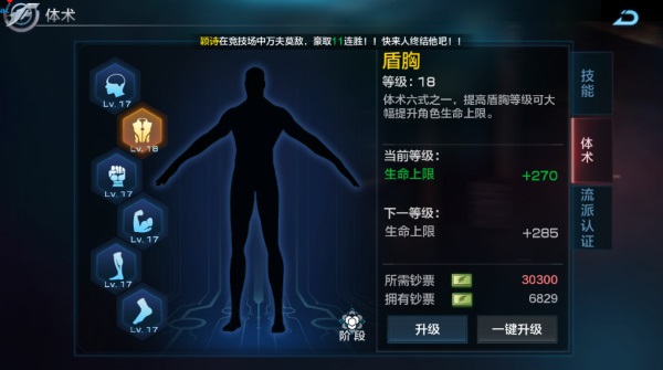 在《拳皇世界》中,可以消耗钞票升级体术即可提升攻击力、防御力、生命上限、暴击等多种属性,是提升战力的重要途径之一。分为体术六式:灵脑、盾胸、掌劈、力臂、神腿、风足。