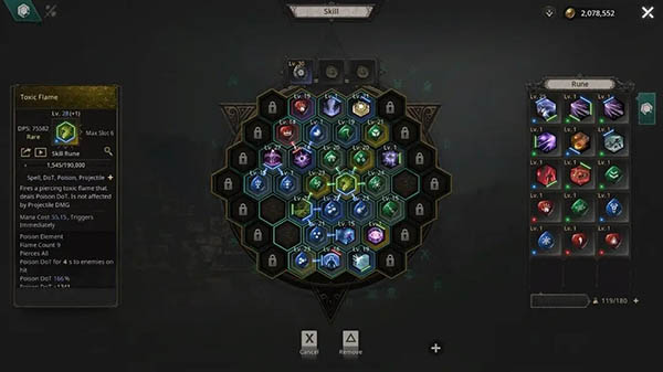 符文升级和强化: 玩家可以透过狩猎或拆解不需要的符文来增加升级和强化符文。请记住,随着符文升级,效果将会加强,能力点数和法力消耗也会提高。符文有四个等级,一般、魔法、稀有和传奇,可以透过符文附魔升级。