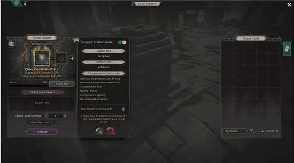 混沌石像:玩家可以透过通关混沌地下城,获得经验值来升级雕像。地下城的通关难度和可以使用的混沌卡片等级将随石像等级的增加而增加。