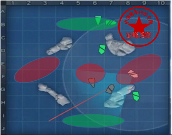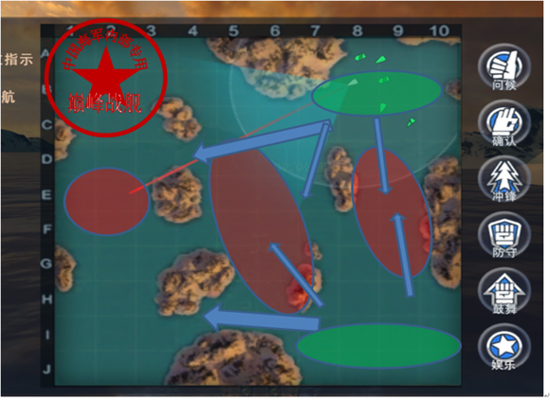 椭圆形绿色区域为双方出生点,地图中心圆形红色区域为据点,红色椭圆形区域代表初期区域,主要交火区域为据点附近,粗蓝色箭头代表双方大部队最佳前进方向,细蓝色箭头代表驱逐舰初期前进点灯方向。