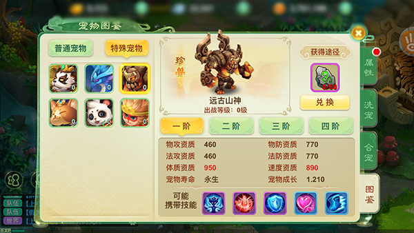 游戏中远古山神就是比较好的血敏宝宝胚子,掌命者只要连续登录就可以领取这只珍兽。远古山神的可携带等级为65级,优点是卡速加药比较主动及时,缺点是比较脆皮,因为要加敏卡速度。体耐速度资质综合来看比较高,要培养的话建议速度比人快50,其余全部加血。打书以8技能不带护肤为准:高级物免,高级法免,高级神佑,高级幸运,高级迅捷,高级隐身,高级灵敏,高级强壮。不过,血宝宝加点方式并不固定,掌命者也可以自行探索套路。