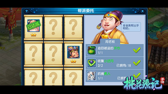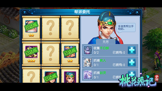 点击任务牌可能随机获得不同星级的委托任务,按照委托订单提交相应的物品后可以交付订单,星级越高获得的帮贡越丰厚。