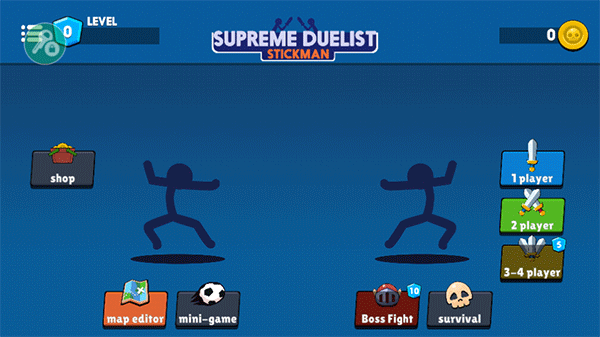 火柴人至高对决(Supreme Duelist Stickman)是一款有趣又疯狂的火柴人手机游戏,又被叫做火柴人至尊对决。不但风格设计卡通、动作场景趣味,还有着独特玩法模式,能够给玩家不一样的火柴人游戏体验。火柴人至高对决内置三种游戏模式,单人模式,和人机斗智斗勇,双人对战,可以和朋友一起玩耍,幸存模式,则是打僵尸一样的敌人,考验生存实力。在单人模式里,玩家可以选择人机的等级,Lv1-Lv9,人机的等级越高,难度越高,但是我们也能选择人机的武器和装扮,也能每局随机,还有多种地图供玩家选择。