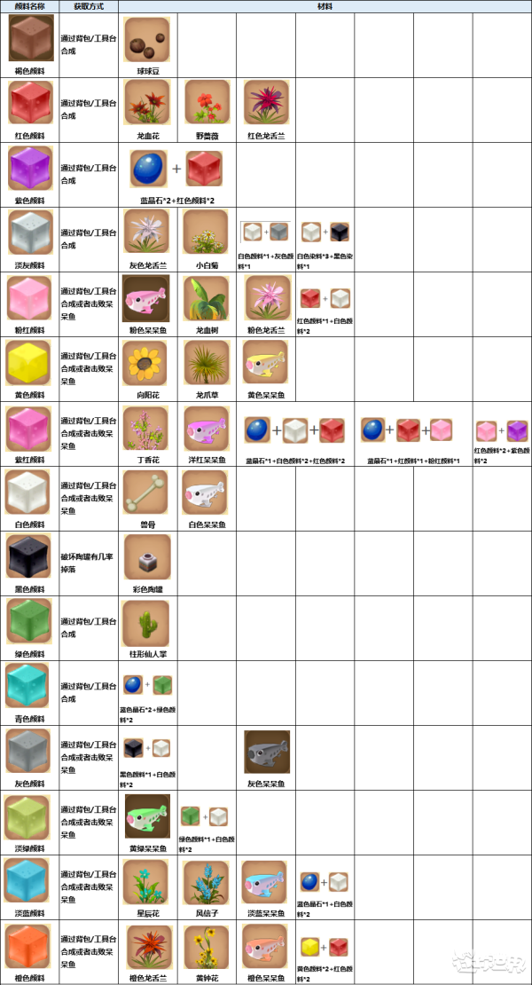 各位冒险家们,小北整理的各颜料的对应表都保存好了吗?有了这个表格,你就可以拥有更多的彩色方块了,快使用更多的彩色方块去装饰你的建筑吧!