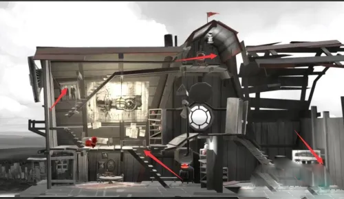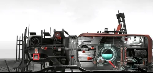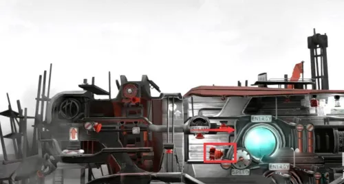 图中高亮的是机关,橙红色,所有图中都是这种颜色机关,由于人只能控制前后和跳跃动作,所以按钮基本就是顶,踩,推 这几种。能量液用于驱动后面的 “房车(帆车)”。能量液不直接叫燃料,因为它后面可以用来灭火,叫燃料有点违和。