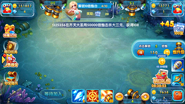 炮台是游戏里最重要的道具,相对来说捕鱼时使用的倍率也是相当重要的,那么在进行游戏的时候,我们要学会根据不同的鱼类、BOSS来选择不同的炮倍。比如在刚进入渔场的时候,BOSS如果还没出现,我们可以切换成低倍炮,捕抓小鱼热热身,节省金币,等待BOSS出现之后,再切换成高倍,实现捕鱼奖励最大化,从而在游戏中获得更多的金币。