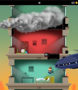 2、躲避激光枪。如果老爸被激光枪打到一次,身体就会变小,破坏力也随之下降,需要跳跃两次才能破坏楼层。