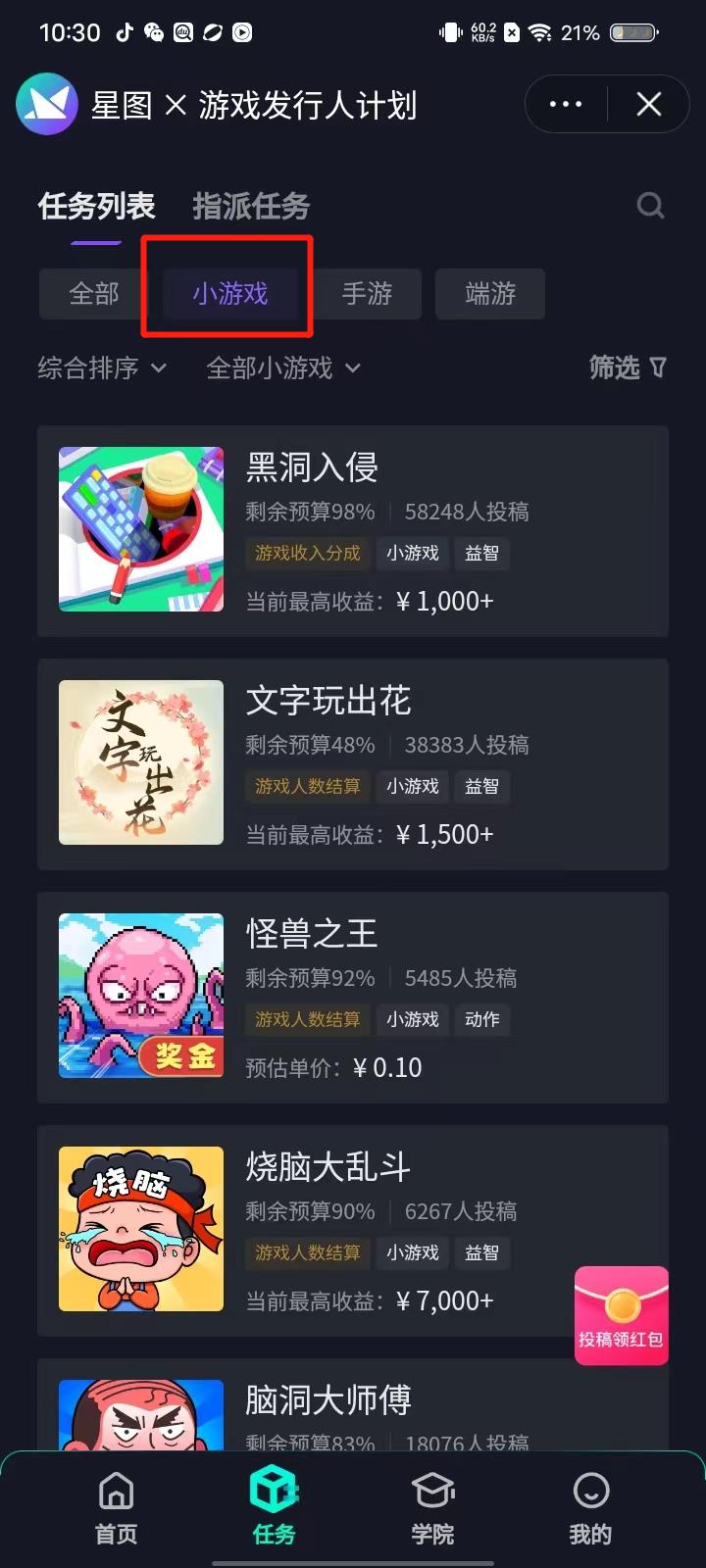 4、在任务列表下,选择“小游戏”,再选择你喜欢的游戏;