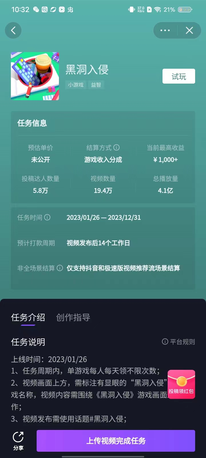 6、记住任务要求后,点击下方“上传视频完成任务”,就可以赚钱了。