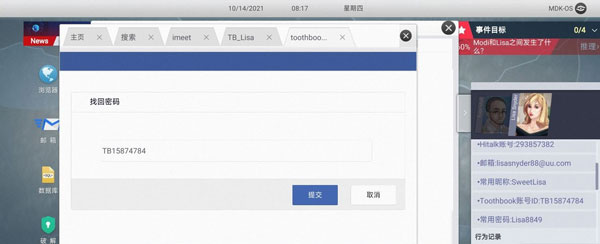 10. 用邮箱找回Lisa的Toothbook,收集信息【总是在没有人的时候一次又一次家暴我】、【那都是他在家暴我之后主动示好送给我的】、【同学电话021-498-4937】、【照片】。