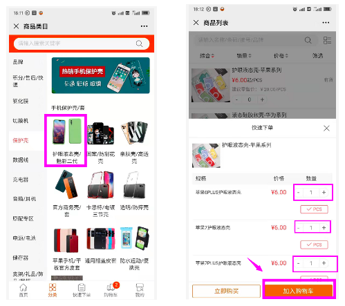 也可以,点击分类,选择你感兴趣的分类,到达商品列表页,输入数量加入购物车
