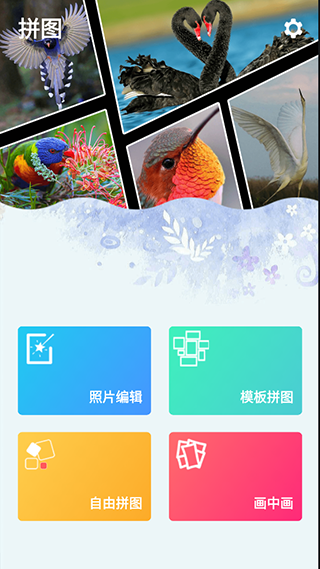 1、打开拼图app,如下图所示,支持照片编辑、套用模板拼图、自由拼图等;