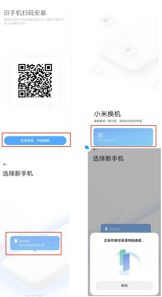 新手机选择【完成安装,开始换机】,旧手机安装好【小米换机】并开启,点击【旧】后,选择新手机型号,建立连接。