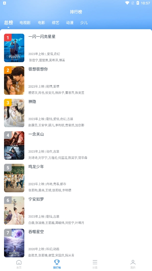 3、在排行榜页面当中,我们可以看到电视剧、电影、综艺、动漫、少儿等影视热门排行榜。