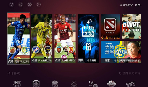 ZNDS智能电视网也拿到了一手的CIBN聚力体育界面图。CIBN聚力体育是一款专为体育迷用户而打造的TV端看体育赛事软件,从界面中即可看出,整个界面清爽简单,以最直白的图文模式向用户展示最详细的赛事信息,直播还是点播内容,在图片封面处均有详细介绍。