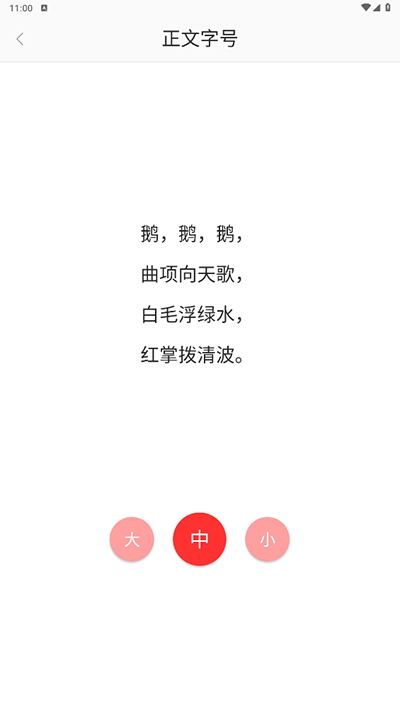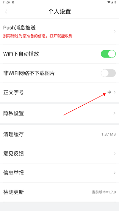 3、接着在【设置】界面内点击【正文字号】;