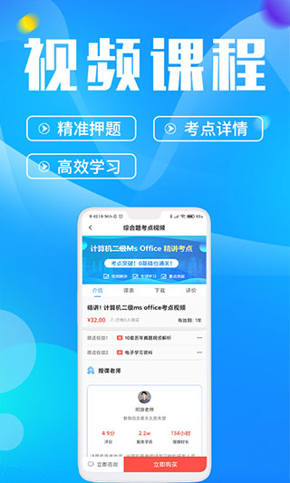 计算机二级MsOffice是一款专为二级高级Ms Office考证设计的题库软件,由四川可为梦想科技有限公司开发,软件拥有大量视频为考生详解考点,拥有丰富的题库,让考生进行实战训练。题库全网实时更新,不用担心题库落后,软件还有多样的做题模式,让学习更加轻松有趣。如果用户需要针对性练习,可选择专题练习,以达到巩固学习精准突破的目的,软件还会自动统计练习错题,针对性巩固练习模拟考试,难题易错题可一次性复习完成,练习过程中还可将题目收入至收藏夹,让找题更加简便。软件还支持离线做题,无需网络一样能做题,充分利用碎片化时间强化自己。需要靠二级office证的用户可以下载使用。