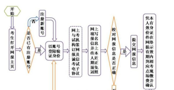 4、如图下面是报考计算机的基本流程,完成注册以后登陆,再一次验证你的身份证号,填写各种信息,上传你的电子照片。完成以后在交费。计算机等级考试的费用是100元。
