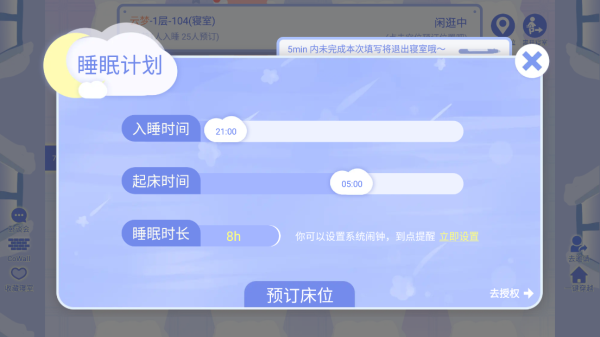 4、点击空床位,填写睡眠计划预定床位,预定该床位