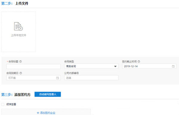2、在页面上上传合同、填写签约方。还可以在上传合同后点击“自动填写签署人”来提取签约方的名称。