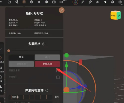 如箭头所示,在“拓扑”下选框里找到“删除高模”点击。