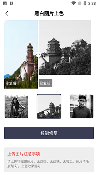4、软件可修复老旧照片、破损照片、旧照片,轻度破损照片,并有黑白照片自动上色功能,智能识别黑白图像内容并填充色彩,黑白照片秒变彩色照片。