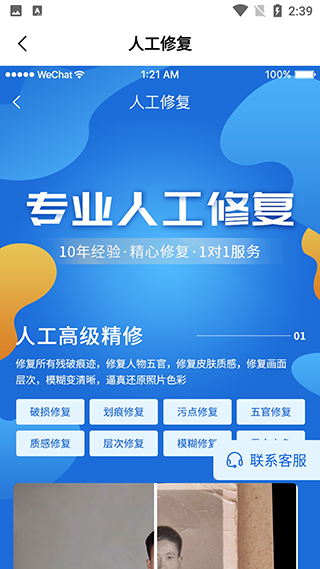对于破损、划痕、折痕、污点或破坏严重的照片,会有专业的人工精修师,手工修复,精修师会最大程度的保留原始照片的形状、细节、神态。精细化处理修复破损照片,让图片变清晰,让照片焕然一新。