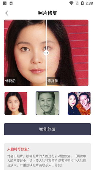 2、人脸修复,可自动识别照片中人物面部五官,针对五官进行修复,高度还原原有五官特征。