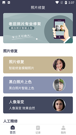1、下载安装后来到首页,有照片修复、黑白照片上色、人像渐变等功能。