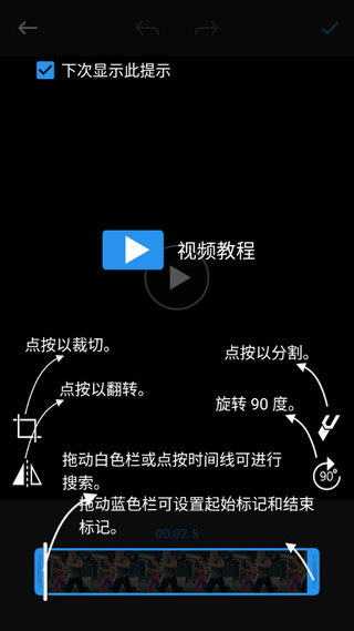 3、编辑视频顾名思义就是剪取视频的片段,进入APP编辑界面后,点击第一个编辑选项,进入编辑后里面会在视频上面加入一个蓝条,这个蓝条内有个白的竖线这个叫做时间轴。拖动蓝条然后选取需要的视频片段,然后点击裁剪按钮就可以完成视频的编辑。此外还提供了视频方向的调整,这个对于拍摄的视频是倒转的或者反向的点击一下即可换成正常的位置。如果需要画面倒转的则点击三角形的图标即可,它会将视频的画面进行倒转。